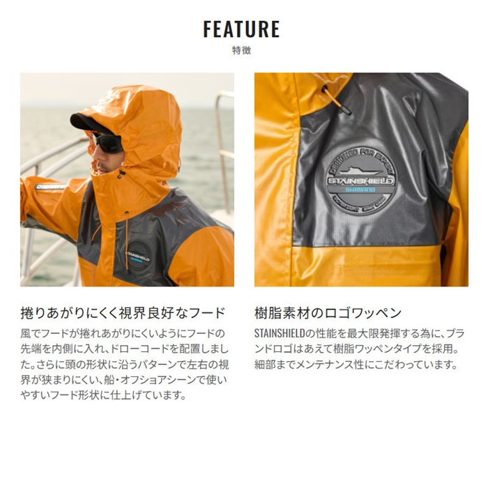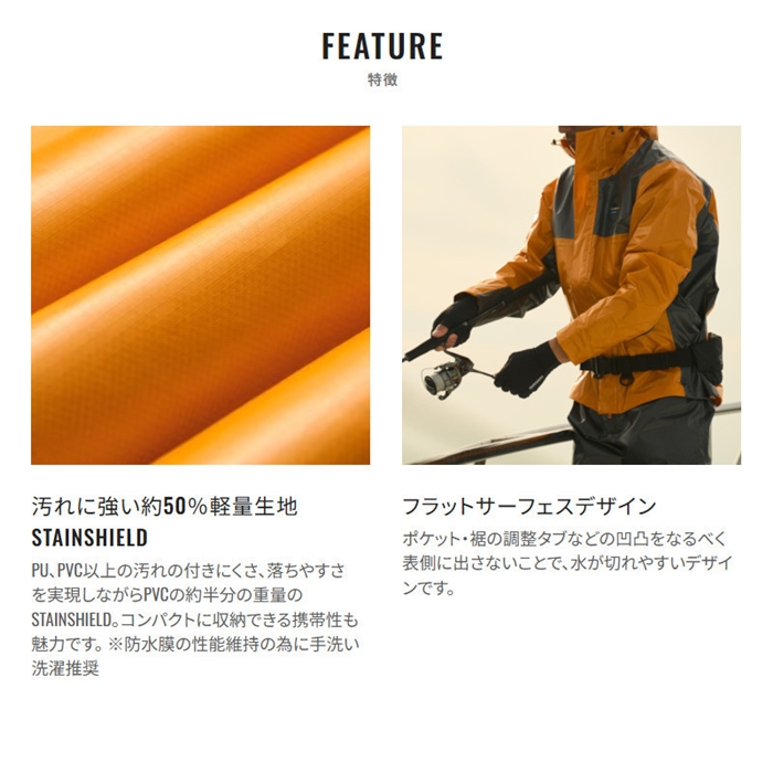 PU、PVCといった従来の生地よりも汚れがつきにくい、汚れが落ちやすい、を実現した特殊生地、STAINSHIELDを採用しました。このSTAINSHIELDは、PVCの重さの約半分という軽量性能をもち、表面の特殊加工で水をかけて軽くこするだけで汚れや匂いの原因が落ちやすく、釣行後や移動時のストレスを軽減します。水や汚れのキレの良さと船釣りでのトラブルレス性を徹底的に重視したフラットサーフェスデザインを採用しました。コンパクトに収納できるため電車釣行や遠征にも適しています。軽量で動きやすく、船釣り師だけでなく、オフショアアングラーにもおすすめなジャケットです。[25new04]