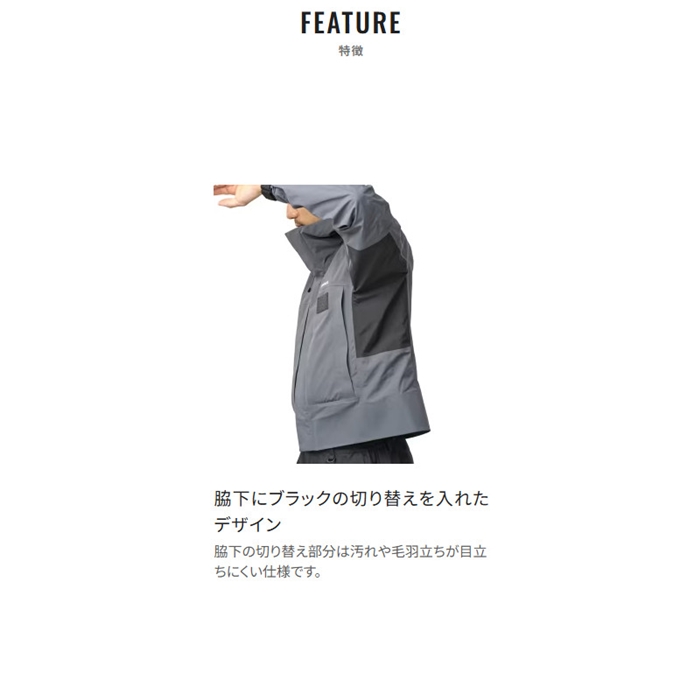 水の浸入を軽減する袖口が特徴のウェーディング用レインジャケット。すこし短めな丈感と裾の全面接着、裏地の高い位置まで表地がカバーしているパターン設計でディープウェーディングでの取り回しが非常に良いジャケットに仕上げました。ポイントの移動時などで水切れが良いのも特徴です。さらに肩部は滑り止めパッドでフローティングベストがずれにくく一体感が向上しました。今作ではベストの上に着用した際に中のベストに簡単にアクセスできるよう、前立てに細かいピッチで面ファスナーを配置しました。好評の背面ネットループは渓流ネットや、後方灯などをつけるのに便利です。[25new04]