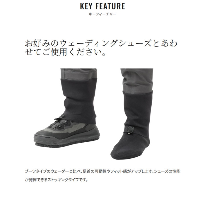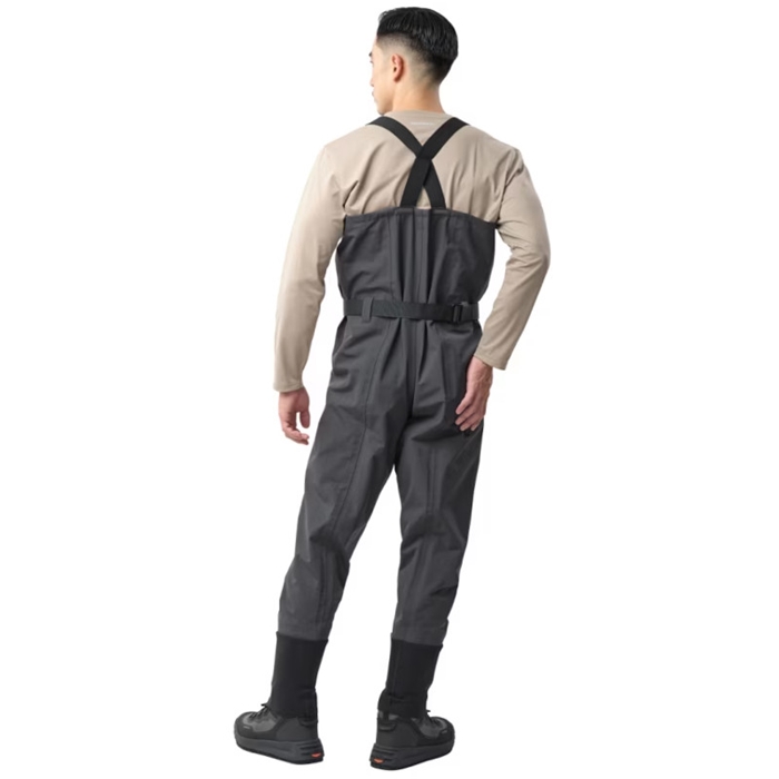 ドライシールド4層生地を新規採用。優れた透湿性能で湿度を外へ放出し不快な蒸れを軽減します。生地を4層にすることで耐摩耗性も高いレベルを実現しました。足部は3mmのソックスタイプなので、お好みのウェーディングシューズと合わせる事ができます。グラベルガード付で、砂やゴミが入りにくくなっています。丈は胸までカバーするチェストハイモデル。[25new04]