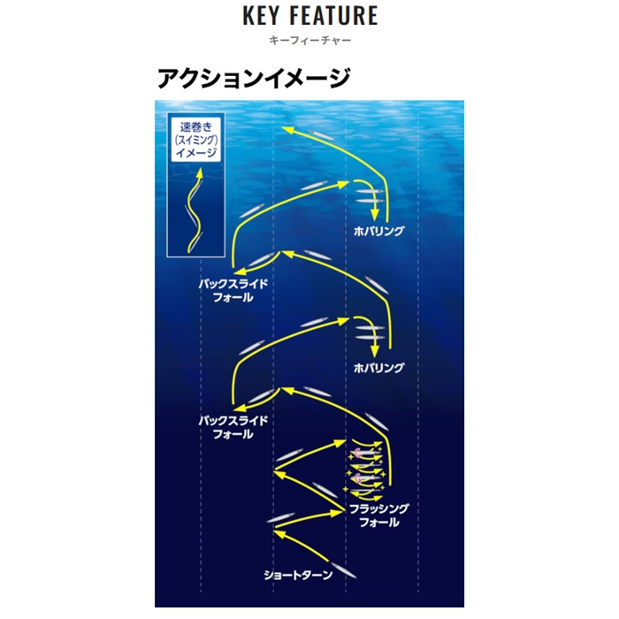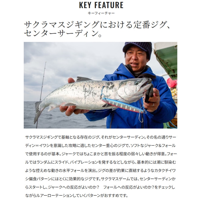 その日のサクラマスが、どんなジグやアクションに反応するか。これを見極める上で欠かせないのがセンターサーディンです。フォールスピードや滞空時間、スライド幅など、すべてがど真ん中の設定。強く長めのジャークの後、ジグが横を向き、フォールに移行する瞬間のバイトがとくに多いのも特徴です。ローテーションの要となりながら、ほかのジグを凌駕する釣果を叩きだすことも。パイロットジグでありつつ、最終兵器にもなりうる。それがセンターサーディンです。価値ある一匹との出会いを願い考案した、サクラスペシャルだけのこだわりカラーは必見です。[25new16][JV-713W]