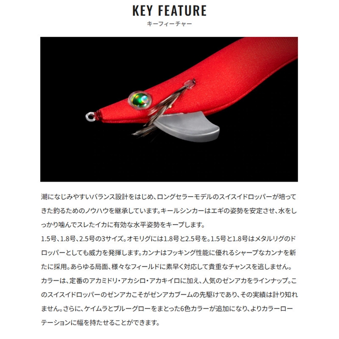 2023年、フラッシュブーストが搭載され、瞬く間に人気となったドロッパーエギ「スイスイドロッパー フラッシュブースト」ですが、その前身であり廃盤となっていたオモリグ専用ドロッパー「スイスイドロッパー」が、ファンからの熱望によって復刻。旧モデルの性能、デザインはそのままに、スレたイカに効果的であり、イカがイライラしてしまうほどの喰わせのスローフォール性能を装備。さらに潮に馴染むバランス設計によって水平姿勢をキープし、ナチュラルにイカを誘います。またサーフボードのフィンを想像させるキールシンカーで、より確実に潮に乗ってアピールします。また、大人気カラーの「ゼンアカ」もラインナップしています。