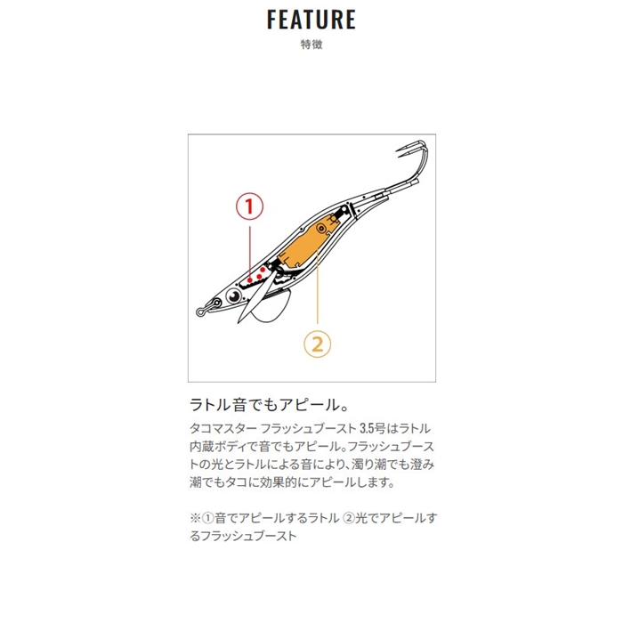 ボディに内蔵された反射板を軽い振動を与えることで自動的にフラッシングさせ、止めている間もアピールするフラッシュブーストを搭載したタコ専用エギ。それがタコマスター フラッシュブースト。アピールが有効とされるタコに対し、ブレードやフラッシャーなど抵抗が増える物を付けることなく強烈アピール。仕掛けの抵抗を最小限に抑えることにより流されにくく、ボトムを取りやすく、小突き、サワリを感じるといったタコ釣り本来の釣趣を引き出します。2025年、各テスターが「釣れるカラー」と太鼓版を押すアピール系の2色が新たにラインナップ。
