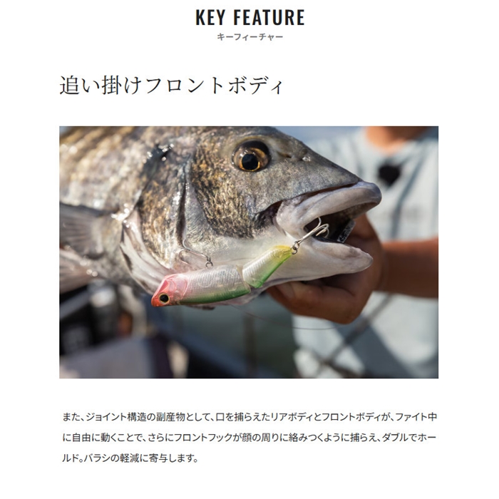 口の小さなクロダイ・キビレ。トップウォーターで狙う楽しみはそのままに、フッキング率向上を目指しました。折れ曲がったリアボディのみが水中に入るよう浮力を設定。水平浮きでは乗り切らないバイトをしっかりと乗せきるひと口サイズのリアボディを有するジョイントポッパーペンシルです。ドッグウォークやポッピングで真夏のブリームゲームをどうぞお楽しみください![25new16]