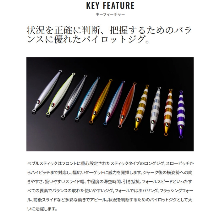 軽いジャークですばやく横を向くスライドと、その後のフリーズアクション。過剰なフォールアクションを抑えたぺブル系の特徴である肉厚ボディに、スリム化してスリットを入れ水抜け感を追求。スローからハイピッチまで青物から根魚まで対応します。スリムが故に沈みもスムーズなので、260g以上のモデルは中深海にもオススメ。[25new16]