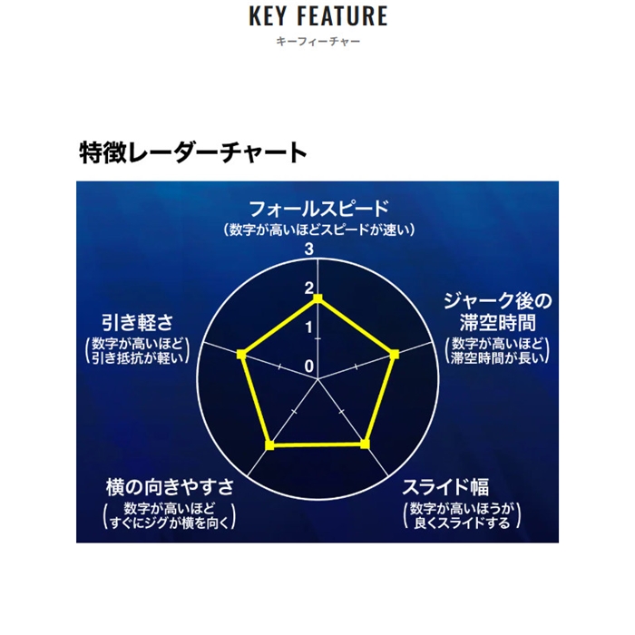 軽いジャークですばやく横を向くスライドと、その後のフリーズアクション。過剰なフォールアクションを抑えたぺブル系の特徴である肉厚ボディに、スリム化してスリットを入れ水抜け感を追求。スローからハイピッチまで青物から根魚まで対応します。スリムが故に沈みもスムーズなので、260g以上のモデルは中深海にもオススメ。[25new16]