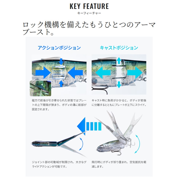 操ることに特化した、もう一つのアーマブースト機構を搭載したグラヴィテーター220SF。アングラーが意図してビッグフィッシュに仕掛けることができるグライドベイトです。ボディをコンパクトに折りたたむことで、ジョイントベイトの致命的な弱点であるキャスト時のルアーの回転を克服するアーマブースト。ジョイントベイトの従来イメージを覆す遠投性能とアキュラシーを実現しました。[25new16]