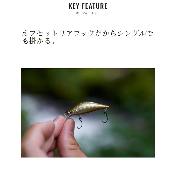小渓流攻略のパーフェクトバランスを突き詰めた、全長42mmの小粒スローシンキング。重量2.4gの高浮力ボディがロッドワークへの優れた追従性を生み、小さなポケットウォーターで手数の多いヒラ打ち演出が可能。フロント寄りの重心設定により着水後のワンアクションで水流と絡むため、ルアーを引く距離が短い状況でもチャンスを逃さない。また、こだわりのオフセット構造がリアフックの暴れを抑制し、シングルバーブレス使用時のフックアップ確率も向上。フォール中は水平姿勢を維持し、ドリフト的なローテンションな誘いにおいてもターゲットにバイトさせる力を持つ。小渓流、枝沢、源頭域などあらゆる細流で輝きを放つ新たなリフレインだ。[25new16][CARDIFF REFRAIN]
