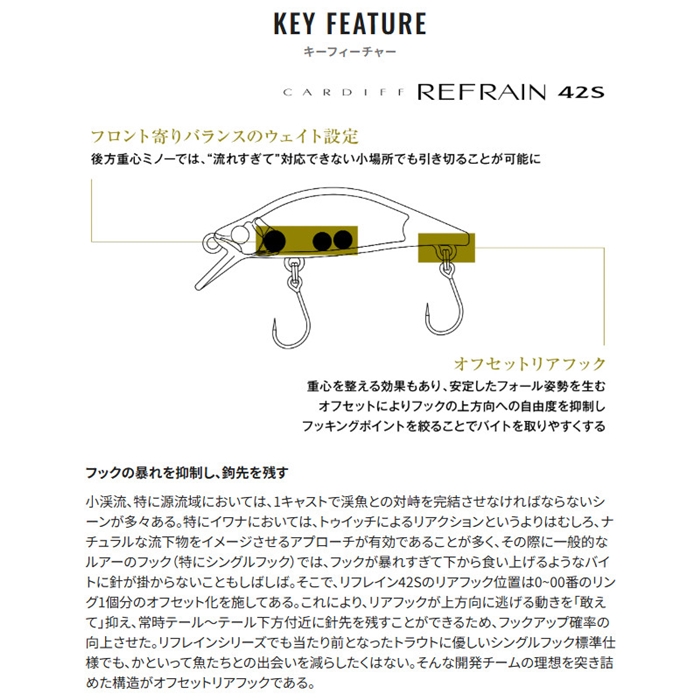 小渓流攻略のパーフェクトバランスを突き詰めた、全長42mmの小粒スローシンキング。重量2.4gの高浮力ボディがロッドワークへの優れた追従性を生み、小さなポケットウォーターで手数の多いヒラ打ち演出が可能。フロント寄りの重心設定により着水後のワンアクションで水流と絡むため、ルアーを引く距離が短い状況でもチャンスを逃さない。また、こだわりのオフセット構造がリアフックの暴れを抑制し、シングルバーブレス使用時のフックアップ確率も向上。フォール中は水平姿勢を維持し、ドリフト的なローテンションな誘いにおいてもターゲットにバイトさせる力を持つ。小渓流、枝沢、源頭域などあらゆる細流で輝きを放つ新たなリフレインだ。[25new16][CARDIFF REFRAIN]