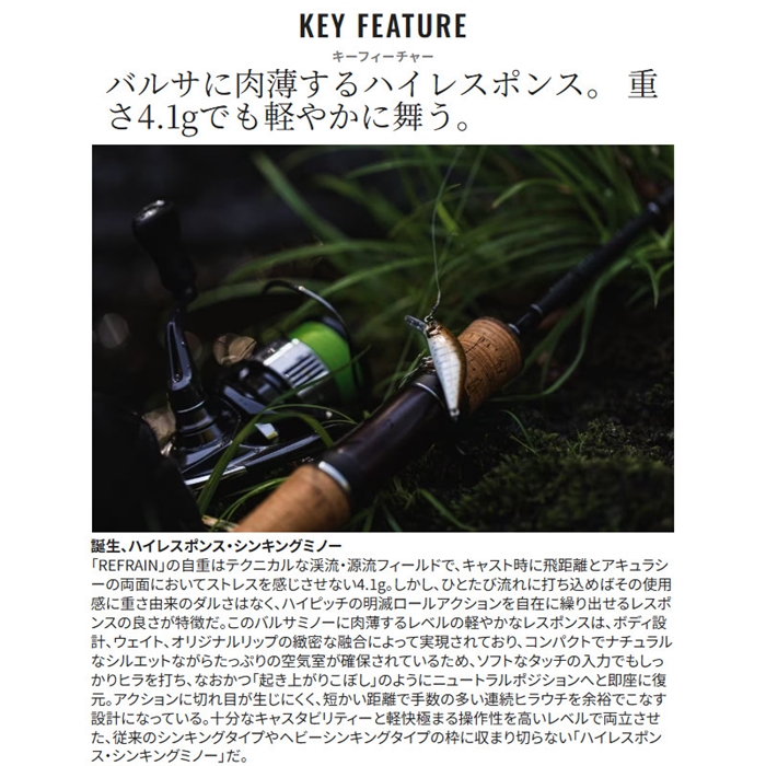 基本アクションはローリング。タングステンウェイトを最下部に設定し、強い流れや逆引きでのトゥイッチ時でも、安定した泳ぎと、明滅がトラウトを誘惑します。ほんの少しの後方重心で、飛距離やキャスタビリティを犠牲にせず、テンションフォールではシミーフォール。着水後にトラウトに見切られにくい沈降姿勢です。オススメはアップでやや竿を立てたショートトゥイッチ。レスポンス良く、小気味よい操作感でミノーゲームを楽しめます。[25new16]