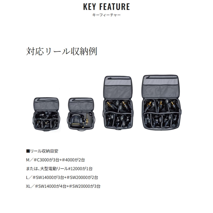複数個のリールの保管や遠征時の持ち運びに使いやすいリールケース。セミハードの成型フタを採用し、リールの保管・移動時の保護性能を向上しました。シマノリールを想定した3サイズ展開と着脱式の仕切りが付き、所有リールに合わせた収納が可能です。