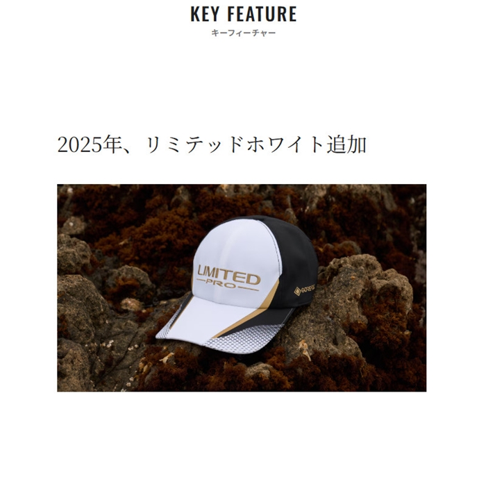 悪天候時の頭部の濡れを防ぐだけでなく、蒸れも防いでくれるゴアテックスを採用。雨を気にすることなく釣りを楽しむことが可能です。防水性能は当然ながら優れた透湿機能も持っており、長時間着用していてもムレにくい仕様です。風対策としてナノフロント繊維を使用し摩擦を高めた滑り止めテープ付きで、多少の風には飛ばされにくくなっています。さらに強風時にはキャップストラップを装着することで対応できるようになっています。2025年、リミテッドホワイトがラインナップに加わりました。[25new04]