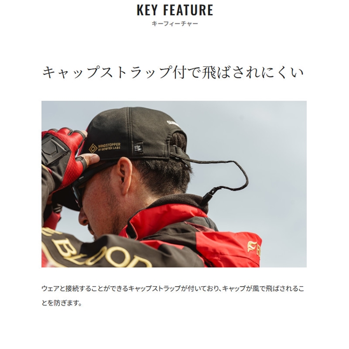 防風透湿機能のあるウィンドストッパー バイ ゴアテックス ラボ生地を採用したキャップです。小雨程度なら気にすることなく釣りを楽しむことが可能です。防風性能だけでなく、優れた透湿機能で長時間着用していてもムレにくい仕様です。さらに強風時にはキャップストラップを装着することで対応できるようになっています。2025年、リミテッドホワイトがラインナップに加わりました。[25new04]