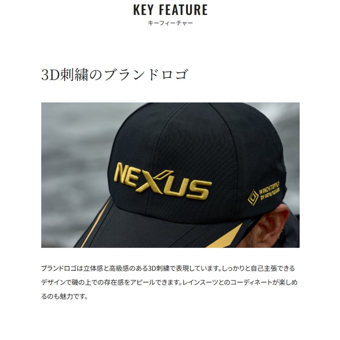 防風透湿機能のあるウィンドストッパー バイ ゴアテックス ラボ生地を採用したキャップです。小雨程度なら気にすることなく釣りを楽しむことが可能です。防風性能だけでなく、優れた透湿機能で長時間着用していてもムレにくい仕様です。3D刺繍のネクサスロゴがアクセントとなり、レインスーツとのコーディネートが楽しめます。磯の上でしっかり自己主張できるアイテムです。[25new04]