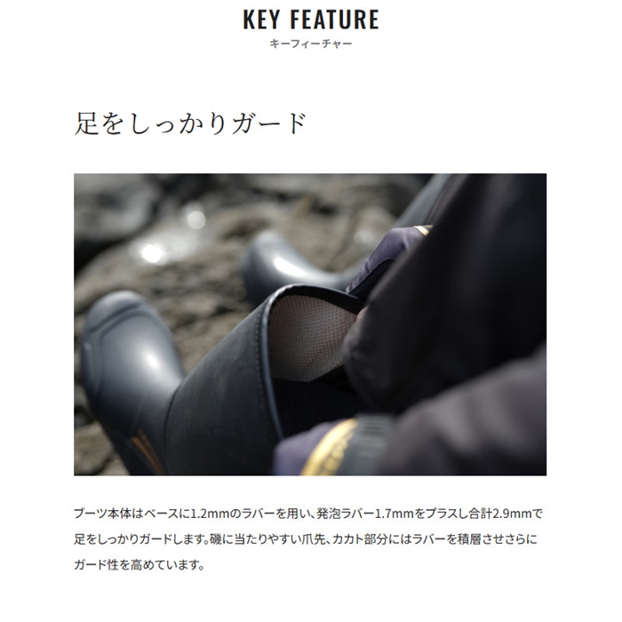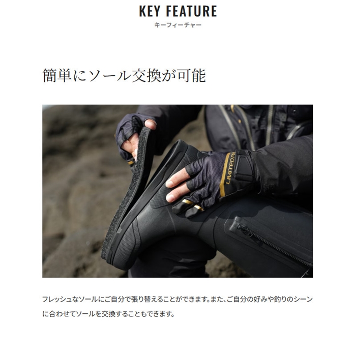 ベースに1.2mmのラバー、内側に発砲ラバー1.7mmを採用したジオロック搭載の磯用ブーツです。脱ぎ履きしやすいサイドファスナーを採用。自分でソールを張り替えたり、場所に合わせてソールの種類も簡単に変えることができるジオロックを搭載した仕様になります。この完成度の高いブーツに今季からリミテッドホワイトが追加されました。[25new04]