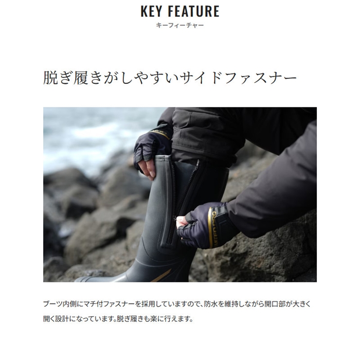 ベースに1.2mmのラバー、内側に発砲ラバー1.7mmを採用したジオロック搭載の磯用ブーツです。脱ぎ履きしやすいサイドファスナーを採用。自分でソールを張り替えたり、場所に合わせてソールの種類も簡単に変えることができるジオロックを搭載した仕様になります。この完成度の高いブーツに今季からリミテッドホワイトが追加されました。[25new04]