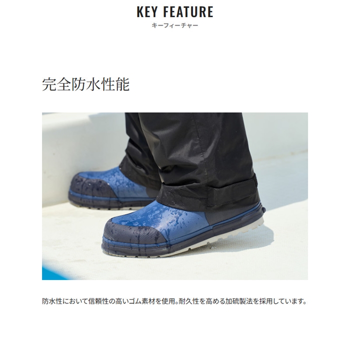 防寒船ブーツがさらに暖かくなりました。新しい防寒船ブーツには、フェルト材にアルミシートを挟み込んだソックスが内蔵されています。そのソックスと同じ材料のインソールも付属しており、ブーティーとブーツの間に入れることで足裏部分が二重構造になり、より暖かさをキープします。二重構造によりフィット感も向上します。ブーツ本体にはヒールキッカーが付いており、脱ぐ際も楽々です。また、シマノオリジナルアウトソールはエサを使うことを考慮した設計で、ブロックが大きくエサの目詰まりを起こしにくい構造になっています。ソールの材料は非常にソフトで、優れたグリップ力を発揮します。アッパーはラバー製で、汚れてもメンテナンスが簡単です。まさに餌師の冬の定番となる防寒ブーツです。