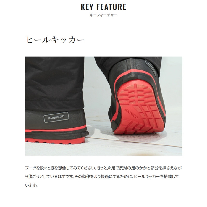 防寒船ブーツがさらに暖かくなりました。新しい防寒船ブーツには、フェルト材にアルミシートを挟み込んだソックスが内蔵されています。そのソックスと同じ材料のインソールも付属しており、ブーティーとブーツの間に入れることで足裏部分が二重構造になり、より暖かさをキープします。二重構造によりフィット感も向上します。ブーツ本体にはヒールキッカーが付いており、脱ぐ際も楽々です。また、シマノオリジナルアウトソールはエサを使うことを考慮した設計で、ブロックが大きくエサの目詰まりを起こしにくい構造になっています。ソールの材料は非常にソフトで、優れたグリップ力を発揮します。アッパーはラバー製で、汚れてもメンテナンスが簡単です。まさに餌師の冬の定番となる防寒ブーツです。