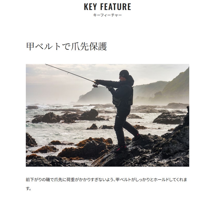 磯で定番のソール、カットラバーピンフェルトを搭載した防水シューズです。大きくなったミッドソールに伴い、ソールも大きくなり、磯の上での安定感も向上しました。また、ソールとミッドソールが大きくなることで、靴本体に磯が当たることを防ぎ、本体の耐久性も向上しています。ボアダイヤルはL+1 Dial Dを採用しており、しっかりと締め込むことができ、太いワイヤーで耐久性も向上しています。さらに、防水膜にはシマノオリジナルのドライシールドプラスを採用することで、防水の耐久性も向上しています。基本性能が大幅に向上した磯シューズです。[25new04]