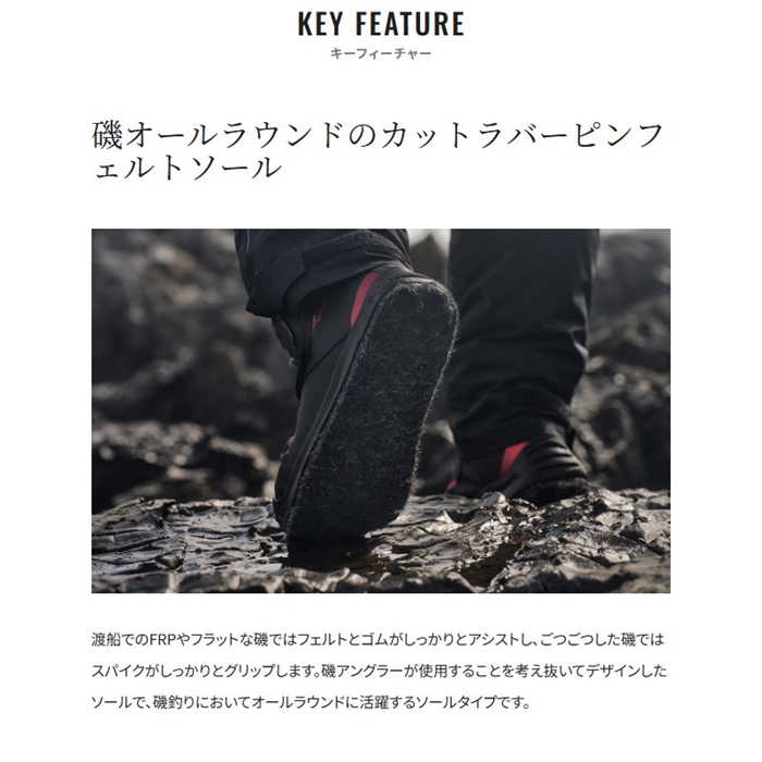 磯で定番のソール、カットラバーピンフェルトを搭載した防水シューズです。大きくなったミッドソールに伴い、ソールも大きくなり、磯の上での安定感も向上しました。また、ソールとミッドソールが大きくなることで、靴本体に磯が当たることを防ぎ、本体の耐久性も向上しています。ボアダイヤルはL+1 Dial Dを採用しており、しっかりと締め込むことができ、太いワイヤーで耐久性も向上しています。さらに、防水膜にはシマノオリジナルのドライシールドプラスを採用することで、防水の耐久性も向上しています。基本性能が大幅に向上した磯シューズです。[25new04]
