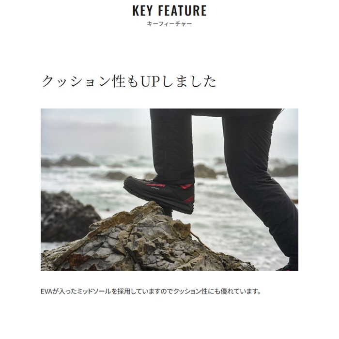 磯で定番のソール、カットラバーピンフェルトを搭載した防水シューズです。大きくなったミッドソールに伴い、ソールも大きくなり、磯の上での安定感も向上しました。また、ソールとミッドソールが大きくなることで、靴本体に磯が当たることを防ぎ、本体の耐久性も向上しています。ボアダイヤルはL+1 Dial Dを採用しており、しっかりと締め込むことができ、太いワイヤーで耐久性も向上しています。さらに、防水膜にはシマノオリジナルのドライシールドプラスを採用することで、防水の耐久性も向上しています。基本性能が大幅に向上した磯シューズです。[25new04]
