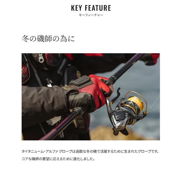 高い保温性のタイタニューム・アルファ採用。糸掛かりを軽減しつつ、鈎を取り出しやすい新設計のマグネット鈎ホルダーや握りやすさにこだわった指抜き形状など細部にこだわり続けて操作性をさらに向上させたグローブです。保温性と操作性のバランスに優れる親指、人差し指、中指の指ぬき仕様。このハイエンドモデルは冬の磯で実力を発揮します。2025年、リミテッドホワイトがラインナップに加わりました。[25new04]