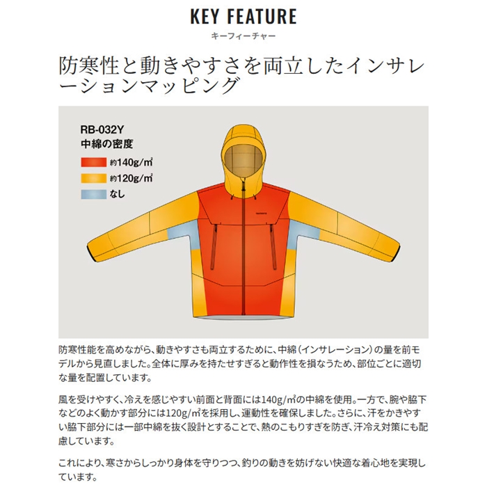 冬の釣りに求められる「保温性」と「動きやすさ」。相反するこの2つの機能を高次元で両立したのが、このフラッグシップモデルです。中綿にはメンテナンス性と軽量性に優れた「エアロカプセル」を採用し、保温力を強化。さらに、軽量なGORE-TEX ePEメンブレンを採用することで、従来比約10%の軽量化(※Lサイズ換算)を実現しました。防寒性と快適な動作性のバランスを高めるため、部位ごとにインサレーションの厚みを最適化。風を受けやすく体感温度に影響しやすい前面・背面には140g/平方メートル、腕や脇まわりなど可動域が広い箇所には120g/平方メートルを使用。さらに、熱がこもりやすい脇下には一部中綿を抜く設計で、汗冷えを防ぎながら快適性を保ちます。裏地には滑りの良いカーボン糸蓄熱裏地を採用。レイヤリングとの相性が良く、動きを妨げずに暖かさを感じられる仕様です。外袖はトラブルを避けるタブレスデザイン、内袖には調整タブ付きのクロロプレン素材を採用し、水の侵入を抑える工夫も施しています。細部にまでこだわり抜いた設計により、過酷な冬の釣行でも集中力を持続できる、理想的なフィッシング防寒ジャケットが完成しました。[25new04]