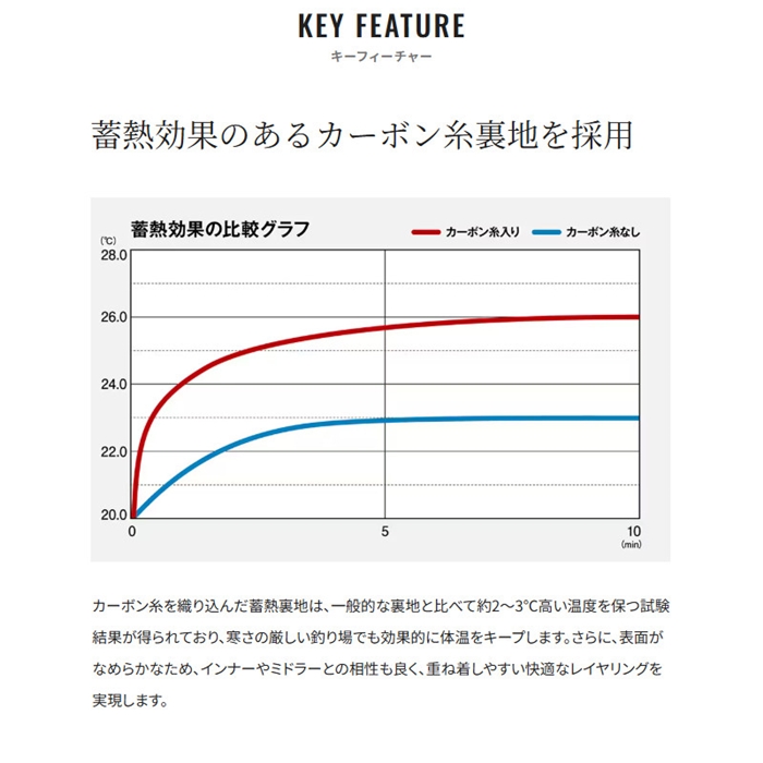 冬の釣りに求められる「保温性」と「動きやすさ」。相反するこの2つの機能を高次元で両立したのが、このフラッグシップモデルです。中綿にはメンテナンス性と軽量性に優れた「エアロカプセル」を採用し、保温力を強化。さらに、軽量なGORE-TEX ePEメンブレンを採用することで、従来比約10%の軽量化(※Lサイズ換算)を実現しました。防寒性と快適な動作性のバランスを高めるため、部位ごとにインサレーションの厚みを最適化。風を受けやすく体感温度に影響しやすい前面・背面には140g/平方メートル、腕や脇まわりなど可動域が広い箇所には120g/平方メートルを使用。さらに、熱がこもりやすい脇下には一部中綿を抜く設計で、汗冷えを防ぎながら快適性を保ちます。裏地には滑りの良いカーボン糸蓄熱裏地を採用。レイヤリングとの相性が良く、動きを妨げずに暖かさを感じられる仕様です。外袖はトラブルを避けるタブレスデザイン、内袖には調整タブ付きのクロロプレン素材を採用し、水の侵入を抑える工夫も施しています。細部にまでこだわり抜いた設計により、過酷な冬の釣行でも集中力を持続できる、理想的なフィッシング防寒ジャケットが完成しました。[25new04]