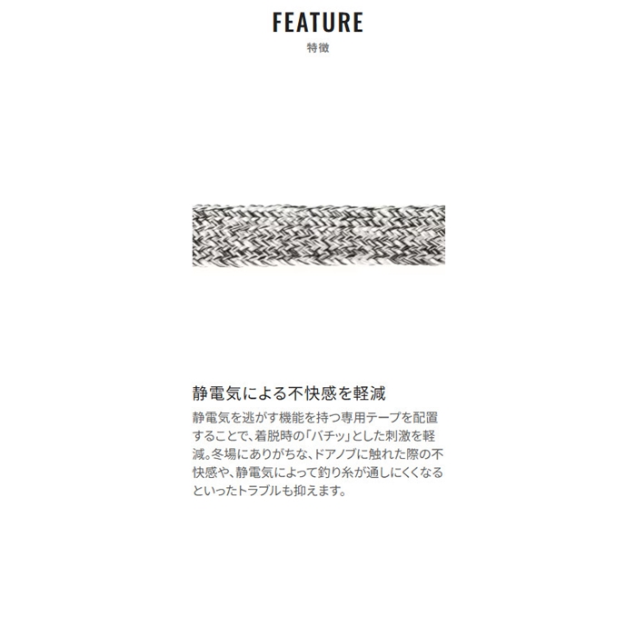 ESインサレーションジャケットは、スタイリッシュなデザインでありながら、信頼性の高い耐久防水基準「ドライシールドプラス」をクリアした高機能ジャケットです。収納力のあるポケットを備えており、堤防でのライトゲームやボートでのインショアゲームなど、バッグなしでも快適に釣りを楽しめます。防寒性能にも優れており、腰回りには暖かい起毛トリコット裏地を、腕部分には蓄熱性のあるカーボン糸裏地を採用。冬の厳しい釣り場でも、アングラーの体をしっかり寒さから守ります。さらに、海水に対する高い撥水性能を持ち、快適さと美しさを両立。インサレーション量を増加し、防寒性をさらに強化しました。部位ごとにインサレーション量を調整することで、動きやすさも損なわない設計となっています。また、ロッドをホールドする際に擦れやすい脇下部分には、ブラックの切り替えデザインを採用。EVAグリップなどによる汚れや毛羽立ちが目立ちにくく、見た目の美しさも保ちます。[25new04]