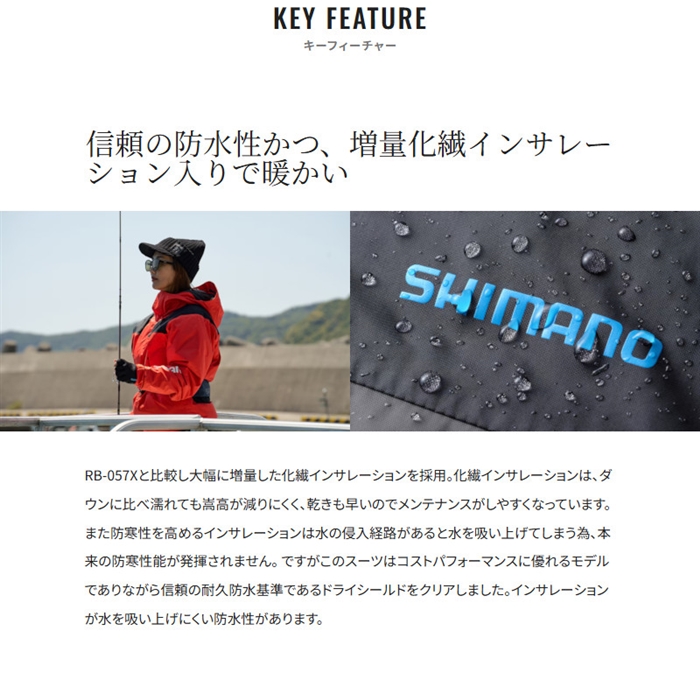 RB-057Xと比較して大幅に増量された化繊インサレーションを採用したこのジャケットは、ダウンに比べて濡れても嵩高が減りにくく、乾きも早くメンテナンスがしやすいのが特徴です。防寒性を高めるインサレーションは、水の浸入経路があると水を吸い上げてしまうため、本来の防寒性能が発揮されません。しかしこのジャケットは信頼の耐久防水基準であるドライシールドをクリアしており、インサレーションが水を吸い上げにくい防水性があります。大容量のポケットが胸から脇の位置に配置されており、自然に手を入れられる位置でありながら、膨脹式肩掛けタイプのライフジャケット着用時にも邪魔にならずにアクセスできる設計です。腰回りにはポケットが配置されていないため、膨脹式腰巻タイプのライフジャケット着用時にもポケットがベルトで潰れることがありません。釣行中にスマホをポケットに入れて写真撮影する際にも、すばやく出し入れが可能で、ハンドレストとしても使いやすい位置にあります。前モデルと比べてインサレーション量を116%に増やしていますが、ウェア全体に増やすのではなく、適所でその量を調節しています。寒さを感じやすい前身頃と後身頃には140g/平方メートルのインサレーションを使用し、腕や脇下など動きが多い場所には120g/平方メートルのインサレーション、フードには80g/平方メートルのインサレーションを入れ、汗をかきやすい脇下はインサレーションを抜く設計となっています。これにより、十分な暖かさを得ながらも、これまで以上の快適性と動きやすさを実現しています。ファスナーにはポリウレタンフィルムでラミネートし、止水性を持たせる処理を施したものを採用し、水の浸入を軽減します。生地の表側にはマットな質感のフルダル糸を採用し、しっとりとした質感を実現しています。裾や袖の面ファスナーアジャスト、パンツの前開き、ウエスト調整、フードアジャストなど、基本性能を押さえながらもコストパフォーマンスに優れたモデルです。さらに、静電気を放電するテープを採用し、冬の着脱時やドアノブに触れる際の静電気の発生を軽減します。これにより、冬の静電気による不快感を軽減し、快適な着用感を提供します。[25new04]
