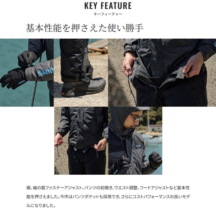 RB-057Xと比較して大幅に増量された化繊インサレーションを採用したこのジャケットは、ダウンに比べて濡れても嵩高が減りにくく、乾きも早くメンテナンスがしやすいのが特徴です。防寒性を高めるインサレーションは、水の浸入経路があると水を吸い上げてしまうため、本来の防寒性能が発揮されません。しかしこのジャケットは信頼の耐久防水基準であるドライシールドをクリアしており、インサレーションが水を吸い上げにくい防水性があります。大容量のポケットが胸から脇の位置に配置されており、自然に手を入れられる位置でありながら、膨脹式肩掛けタイプのライフジャケット着用時にも邪魔にならずにアクセスできる設計です。腰回りにはポケットが配置されていないため、膨脹式腰巻タイプのライフジャケット着用時にもポケットがベルトで潰れることがありません。釣行中にスマホをポケットに入れて写真撮影する際にも、すばやく出し入れが可能で、ハンドレストとしても使いやすい位置にあります。前モデルと比べてインサレーション量を116%に増やしていますが、ウェア全体に増やすのではなく、適所でその量を調節しています。寒さを感じやすい前身頃と後身頃には140g/平方メートルのインサレーションを使用し、腕や脇下など動きが多い場所には120g/平方メートルのインサレーション、フードには80g/平方メートルのインサレーションを入れ、汗をかきやすい脇下はインサレーションを抜く設計となっています。これにより、十分な暖かさを得ながらも、これまで以上の快適性と動きやすさを実現しています。ファスナーにはポリウレタンフィルムでラミネートし、止水性を持たせる処理を施したものを採用し、水の浸入を軽減します。生地の表側にはマットな質感のフルダル糸を採用し、しっとりとした質感を実現しています。裾や袖の面ファスナーアジャスト、パンツの前開き、ウエスト調整、フードアジャストなど、基本性能を押さえながらもコストパフォーマンスに優れたモデルです。さらに、静電気を放電するテープを採用し、冬の着脱時やドアノブに触れる際の静電気の発生を軽減します。これにより、冬の静電気による不快感を軽減し、快適な着用感を提供します。[25new04]