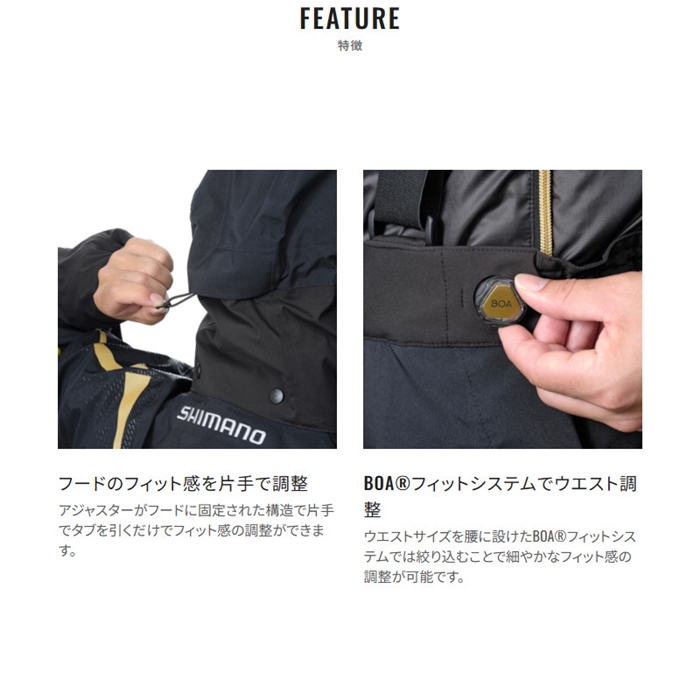 シーズンや気温に応じて防寒性を調整できるミドラーダウンが上下それぞれに付属しています。メイン生地にはY字形状の異形断面糸を使用した特殊織物を採用し、ダウン抜けを軽減しながら生地枚数を減らすことで軽量化を実現。さらにダウンには軽量で保温性の高い800FPダックダウンを使用し、化繊インサレーションとの2重構造設計で耐久性と軽量性をもたせることで過酷な環境での信頼性も向上しています。ミドラージャケットはアウターとジョイントすることで着脱しやすい構造になっています。ミドラーパンツは裾を絞り、ズレ上がりにくいデザインです。メイン生地には強度と軽量性のバランスが取れたゴアテックス ナイロン2L生地を、動きやすさに影響の大きい腕、肩甲骨周りの生地にはゴアテックス 2Lストレッチ生地を、臀部や裾、腰回りなどスレる箇所の生地には200Dの耐摩耗ゴアテックス 2L生地を採用し機能性を高めました。また、従来のePTFEメンブレンと同等の性能を保ちながら、より軽量なゴアテックス ePEメンブレンを採用することで生地において10%軽量化(※シマノ社従来品との比較)を達成しました。裏地には蓄熱効果のあるカーボン糸を採用し、試験結果ではカーボン糸なしの裏地と比較して約2度から3度高い温度をキープ。冬の寒い釣り場でもアングラーの身体を保温します。この裏地はインナーやミドラーの滑りが良くなるため、レイヤリングコーディネートにおすすめです。また、リミテッドプロのロゴがエンボスされた専用デザインを採用しています。フードの内側にキャップを差し込むことでバタつきを抑え、強風時のめくり上がりを軽減。未使用時は内側に収納し、ツバが視界に入りにくくなります。