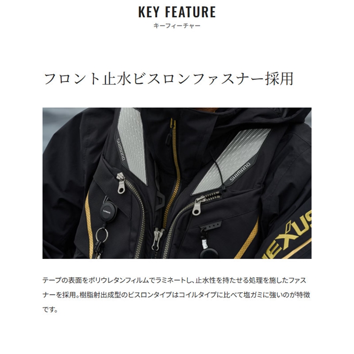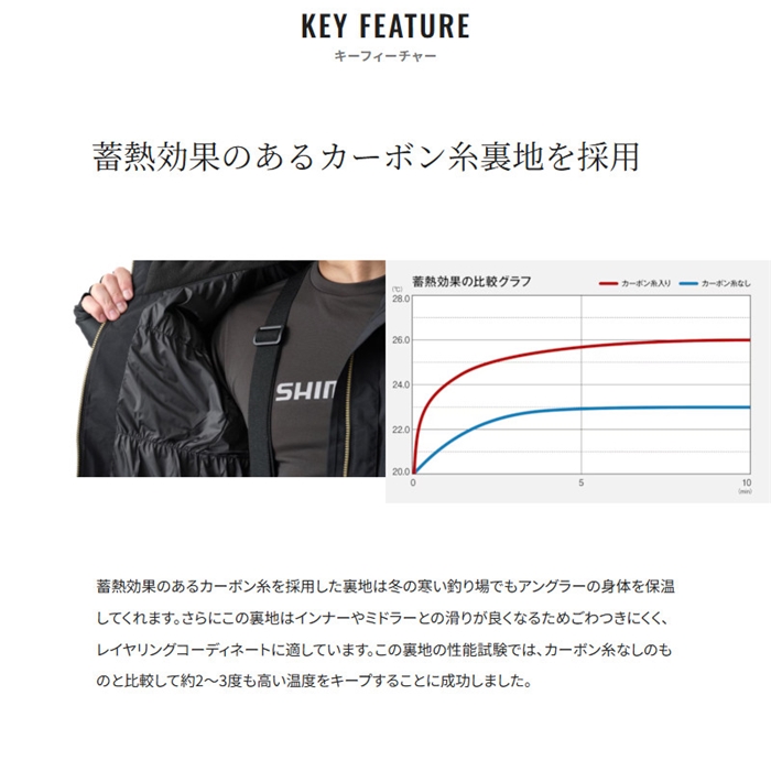磯釣りは、コマセワークや魚とのやり取り、磯の上を移動するなど、身体全体を使う動きの激しい釣りです。RT-133Yでは、そんな磯でのさまざまな動きや身体の可動域を分析し、動きやすさを追求した立体パターン設計を採用しています。従来のePTFEメンブレンと同等の性能を保ちながら、より軽量なゴアテックス ePEメンブレンを今季初めて採用することで生地において10%の軽量化(※シマノ社従来品との比較)を達成。フローティングベストとジョイントすることで一体感が向上し、足元の視界の広さを確保しています。擦れやすい臀部をゴアテックス生地を2重で補強することで防水耐久性を高めました。水を吸い上げないクロロプレン素材の内袖を面ファスナーでフィットさせる仕組みで、水の浸入を軽減します。裏地には蓄熱効果のあるカーボン糸を採用し、試験結果ではカーボン糸なしの裏地と比較して約2度から3度高い温度をキープ。冬の寒い釣り場でもアングラーの身体を保温します。この裏地はインナーやミドラーとの滑りが良くなるため、レイヤリングコーディネートに適しています。フードのアジャスターは片手でタブを引くだけでフィット感を調整できる構造で、テープの表面をポリウレタンフィルムでラミネートし、止水性を持たせる処理を施したファスナーを採用。樹脂射出成型のビスロンタイプはコイルタイプに比べて塩ガミに強いのが特徴です。さらに、静電気を放電するテープを採用し、冬の着脱時やドアノブに触れる際の静電気の発生を軽減。これにより、冬の静電気による不快感を軽減し、快適な着用感を提供します。[25new04]