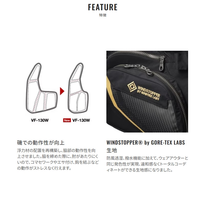 浮力材・ポケット配置を見直し、さらに動きやすく、使いやすくなったフラッグシップ磯フローティングベストの枕付モデルが登場。今季のモデルでは、ウィンドストッパー バイ ゴアテックス ラボ生地を採用し、防風透湿、撥水機能に加えて、ウェアアウターと同じ発色の生地感でトータルコーディネートできるデザインを実現。あらたに搭載したピンオンリールホルダーでツール収納性も向上しました。[25new04]