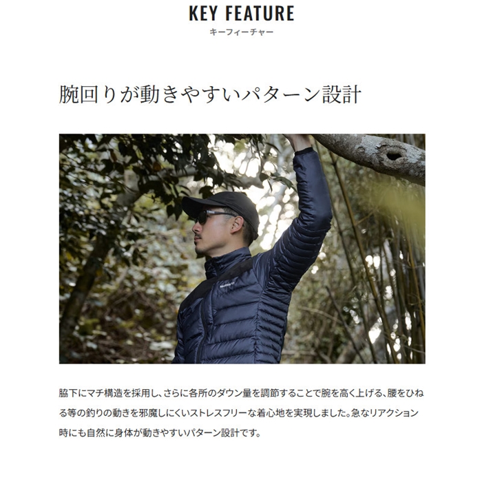 釣りシーンでのミドルレイヤーに必要とされる保温性と軽量性を追求したダウンジャケットです。嵩高性のある800FP高品質ダウンを使用し、裏地にはカーボン糸を含んだ赤外線蓄熱生地を使用し高い保温性を確保しました。濡れやすいことを考えた袖周りは濡れても保温性が落ちにくい化繊中綿を使用し、クロロプレン素材の袖口にするなど、快適に釣りが楽しめるように多くの機能を詰め込みました。さらにこのミドラーはコンパクトにたたんでしまえる収納性も特徴です。オフショアからウェーディングまで冬の厳しい環境でも釣りを楽しめるミドラージャケットです。[25new04]