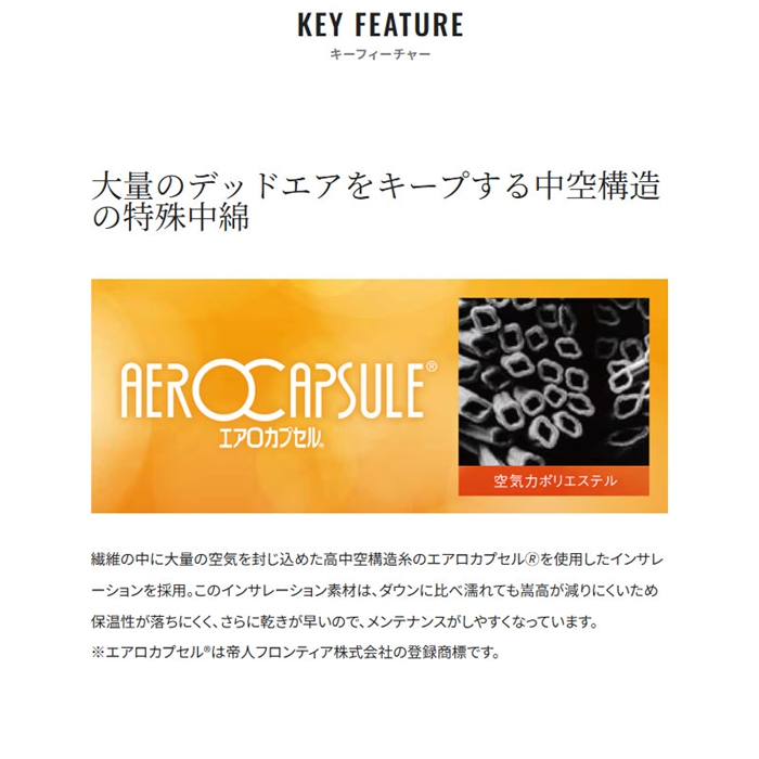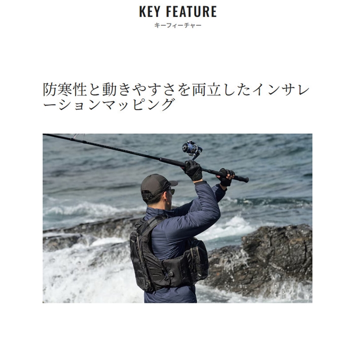 冬のオフショアジギングやロックショアゲームといった、寒さの中でも積極的に動く釣りに求められるのは、「保温性」と「動きやすさ」の両立です。この相反する機能を高い次元でバランスさせ、形にしたのがこのインサレーションジャケット。中綿には、メンテナンス性に優れた「エアロカプセル」を採用し、冬のフィッシングシーンでも体温をしっかりと守ります。[25new04]