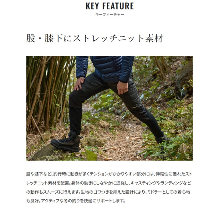 ミドルレイヤーに求められる「保温性」と「軽量性」を追求し、レインウェアの下に着用することを前提としたタイトフィット仕様を採用。寒さを感じやすいお尻や太もも部分には、800フィルパワーの高品質ダウンを封入し、しっかりと保温します。一方で、股下から膝下には動作性を重視したストレッチ素材を配置し、キャスティングやランディング時の動きやすさをサポート。さらに、膝をつく機会が多い釣りの動作に対応するため、膝部分には耐摩耗性の高い素材を採用しています。防寒性・機動力・耐久性のバランスに優れた、アングラーのための実用的なミドラーです。[25new04]