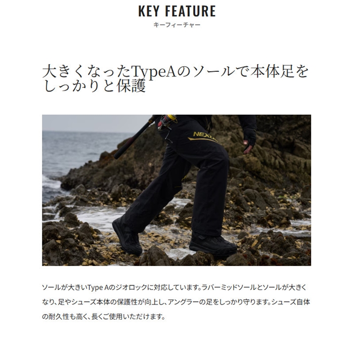 幅広甲高の日本人の足に合う足型を採用しているため、自然なフィット感が得られます。また、BOAフィットシステムのダイヤルにはMサイズを採用しており、太いワイヤーと相まって全体的にしっかりと締め込むことができます。さらに、前下がりの磯でも親指に負荷をかけないように甲ベルトを採用しています。耐久性に関しては、ソールとミッドソールが大きくなったことで、靴本体に磯が当たりにくい構造となり、本体の耐久性が向上しています。防水性能についても、ブーティーにドライシールド+を採用することで、防水の耐久性能が向上しています。戦闘力が向上したネクサスの磯シューズをぜひ履いて体感してください。[25new04]