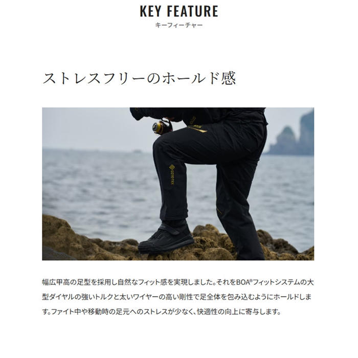 幅広甲高の日本人の足に合う足型を採用しているため、自然なフィット感が得られます。また、BOAフィットシステムのダイヤルにはMサイズを採用しており、太いワイヤーと相まって全体的にしっかりと締め込むことができます。さらに、前下がりの磯でも親指に負荷をかけないように甲ベルトを採用しています。耐久性に関しては、ソールとミッドソールが大きくなったことで、靴本体に磯が当たりにくい構造となり、本体の耐久性が向上しています。防水性能についても、ブーティーにドライシールド+を採用することで、防水の耐久性能が向上しています。戦闘力が向上したネクサスの磯シューズをぜひ履いて体感してください。[25new04]