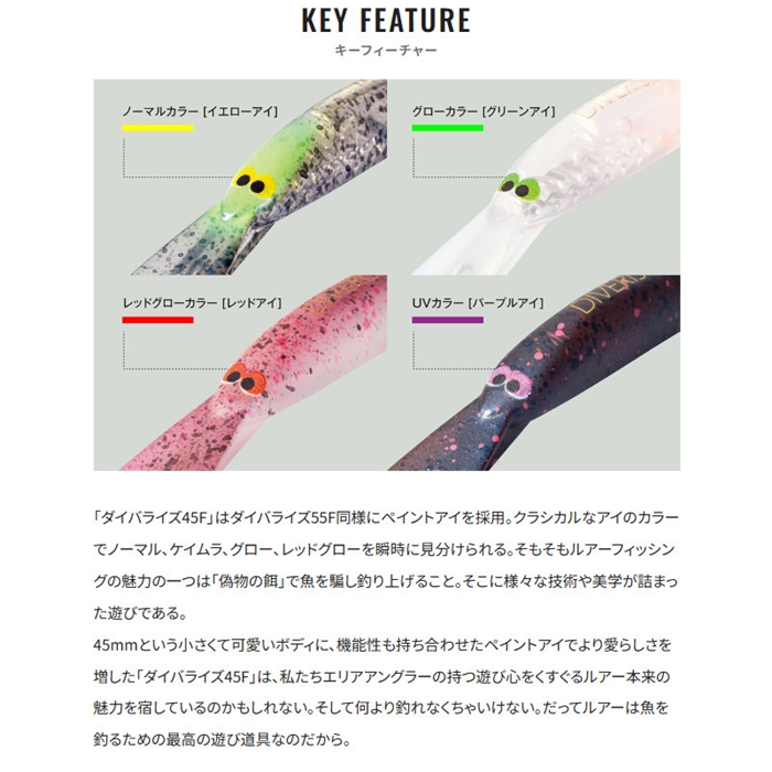 昨今のエリアフィッシングにおいて欠かすことのできないミノーイング。そのメソッドの中でもとりわけ注目されている急潜行・急浮上というキーワードをもとに、アングラーに求められる様々な性能と共に生まれたダイバライズシリーズに45mmサイズが登場。[25new16]