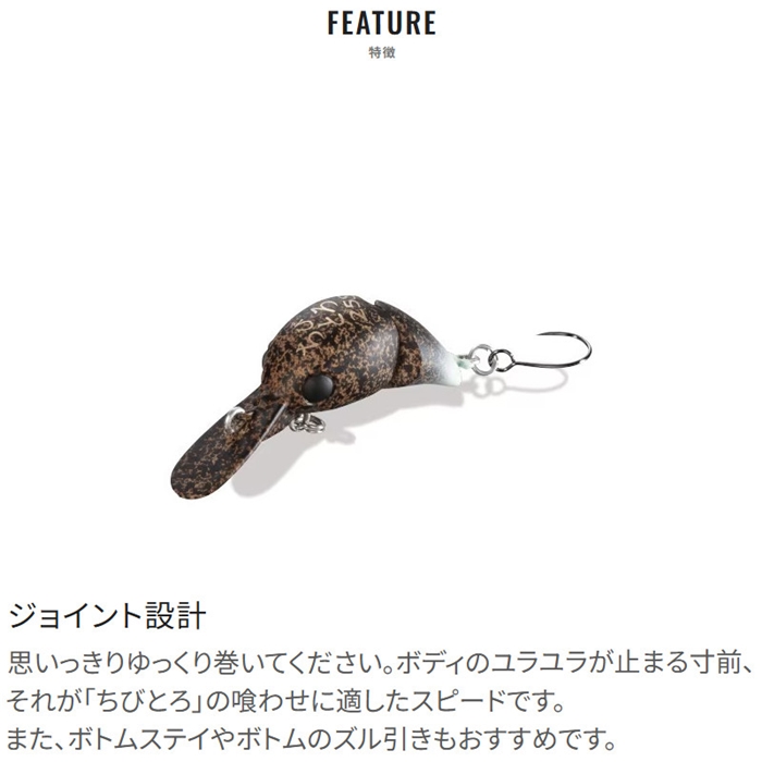 思いっきり、ゆっくりゆっくり巻いてみてください。ボディのユラユラを止められますか?ボディのユラユラが止まる寸前、それが「ちびとろ25S」の喰わせに適したスピードです。デフォルトのフック設定は、テールフックのみ搭載となっていますが、エリアのレギュレーションに合わせて、フロントフックをセットして使うことも可能です。ボトムステイやボトムズル引きもおすすめです。[25new16]