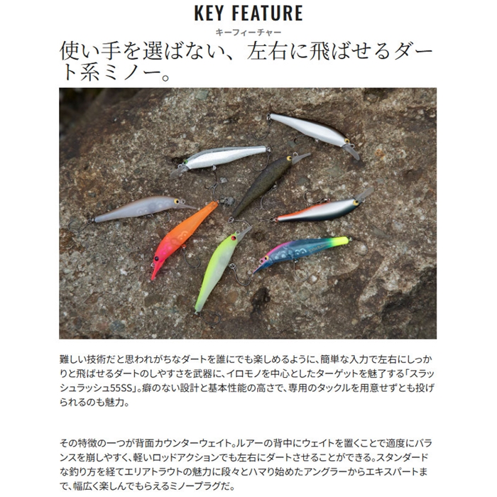 「スラッシュラッシュ55SS」はイワナ、ブラウン、ブルック、ジャガーといった「イロモノ」をメインターゲットにした、シマノが送り出すエリアトラウト用ダート系ミノープラグ。エリアミノーイングの技術の中でも一癖あるダートというメソッドを誰でも簡単に繰り出し、狙ってトラウト達に「口を使わせる」楽しみを感じられるはず。[25new16]