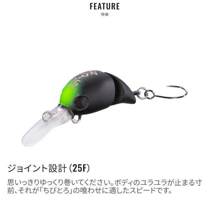 思いっきり、ゆっくりゆっくり巻いてみてください。ボディのユラユラを止められますか?ボディのユラユラが止まる寸前、それが「ちびとろ25F」の喰わせに適したスピードです。デフォルトのフック設定は、テールフックのみ搭載となっていますが、エリアのレギュレーションに合わせて、フロントフックをセットして使うことも可能です。[25new16]