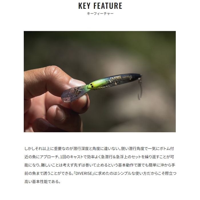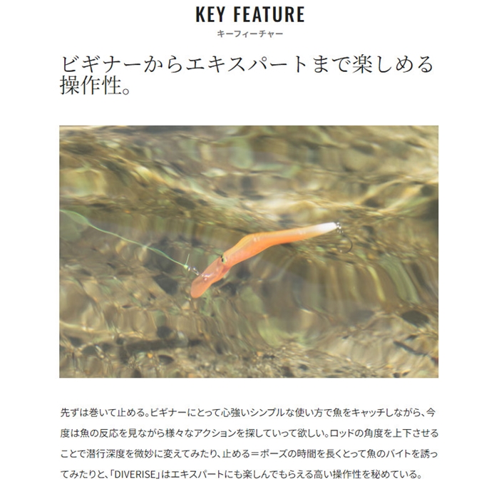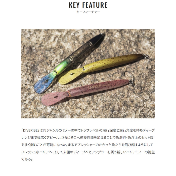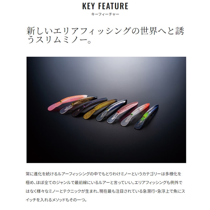 今や定番となった急潜行・急浮上型のエリアプラグ。そこからもう一枚下のレンジまで攻めるための潜行角度と潜行深度と共に、よりフレッシュな魚に届く遠投性能を持たせたスリムミノーです。[25new16]