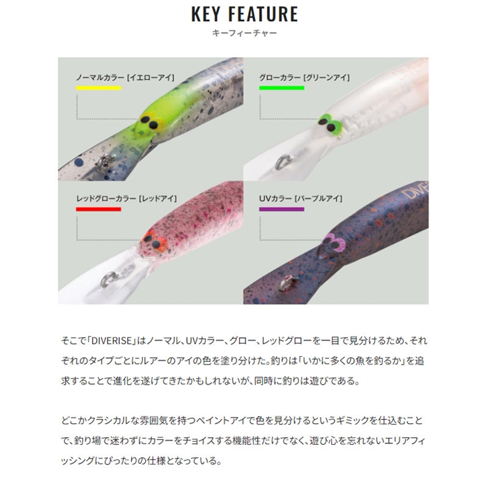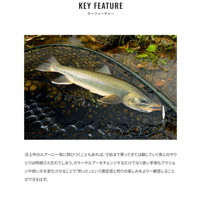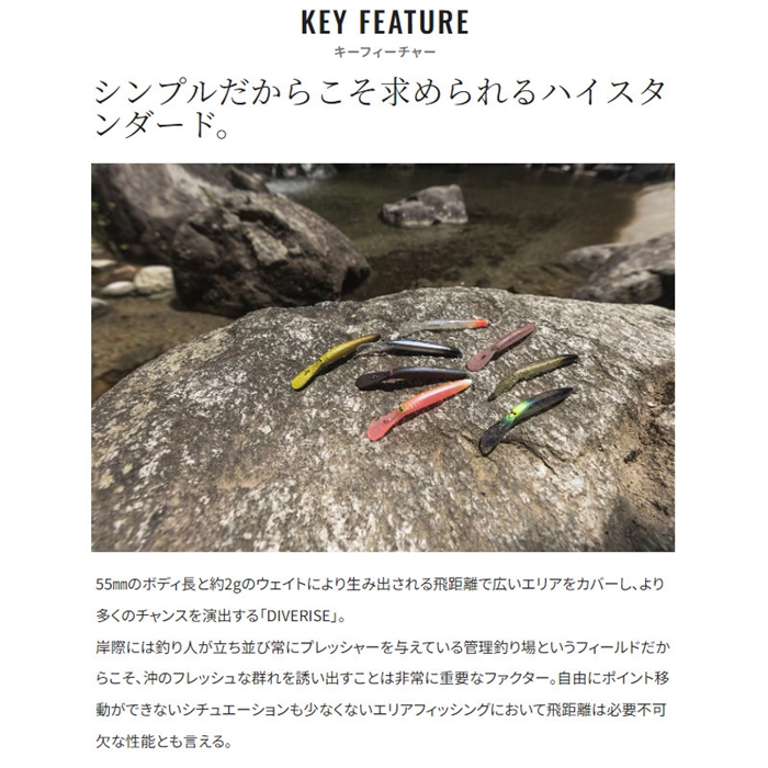 今や定番となった急潜行・急浮上型のエリアプラグ。そこからもう一枚下のレンジまで攻めるための潜行角度と潜行深度と共に、よりフレッシュな魚に届く遠投性能を持たせたスリムミノーです。[25new16]