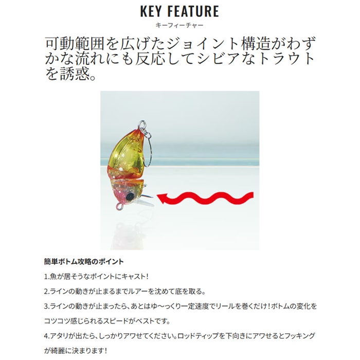 「ちびとろ25F」の開発過程で作成した、7種類の重量が違う最終プロトサンプルの中で、最も重たいタイプにヘビーなフックとスナップをセッティングすると、フローティング狙いのセッティングのハズが、ゆっくりと沈んでしまうことを確認。『これではフローティングとしては浮力が弱いな…』と残念に思いながらもゆっくりリトリーブして来ると、引ったくる様なバイトが?!『まさか?…』と疑いながら同じ様にじっくり沈めて、ゆっくりとボトムをコツコツ感じるスピードでプロトタイプを泳がせると、全く同じラインでさらに強く引ったくるバイトが連発。このパターンを様々なエリアポンドで試してみると、特に表層と低層で温度差があるポンドのボトム攻略時に有効なことがわかりました。しかしこのプロトタイプでは沈下速度が遅すぎ、ボトムコンタクトが難しい為、ボディ形状とウェイトに改良を重ねることで、誰でもボトムレンジを探りやすいようにチューンしました。ボトムでのアピール度を高めるファットボディに昇華を遂げた簡単ボトムプラグが「そことろ30S」です。
