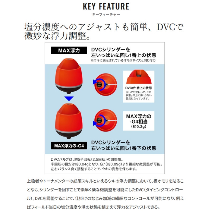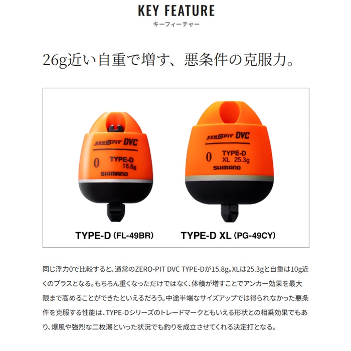 ウキのアンカー効果を最大限高めるには、どっしりした下膨れ形状のTYPE-Dシリーズのフォルムを継承しつつ大型化するのが圧倒的に有利。強風や上潮の影響で道糸が引っ張られ、マキエとの同調がきわめて困難な状況でも、自重があって潮をしっかりつかめるXLサイズなら、道糸の抵抗をものともせず流したいコースからウキがずれにくい。条件が厳しくなるほど発揮されるその威力は、フカセ釣り師の対応幅を広げるあらたな一手となる。