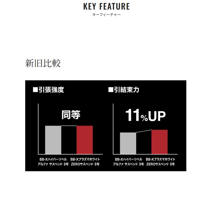 釣り開始から時間が経つにつれて糸さばきが悪くなる…そんな悩みを軽減し、高い視認性を誇るナイロンの道糸がBB-Xプラズマホワイトです。ライン表面をコーティングするのではなく、表面分子を化学的に改質するプラズマ処理によって、最高の状態である製造段階の初期性能を長く維持。剥がれ落ちることがないので、撥水性能の低下を抑えてくれます。マットホワイトの表現が似合うラインカラーは、細くなるほど見やすくなるのも大きな特徴。ZEROサスペンドは海面直下を漂い風や上潮の影響を軽減し、ポイントへの的確なアプローチを可能にします。
