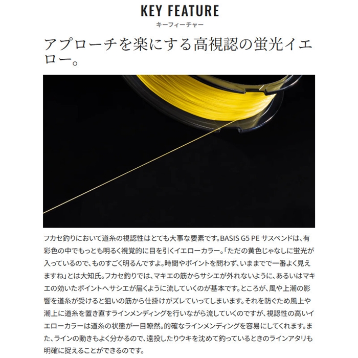 沖の潮目やカケアガリを直撃したい……現代のフカセ釣りにおいて「遠投」は釣果アップのキーワードです。そんなときに強い武器となるのがPEライン。直線強力がナイロンの約3倍だから、3分の1の細号数が使えて飛距離がアップ。水切れが良くてラインメンディングがやりやすく、低伸度でアタリも明確です。BASIS G5 PEサスペンドは、張りと比重を持たせる中芯を1本にすることで耐久性が向上。海面直下を漂う1.3程度の比重と視認性のよいイエローカラーは、風や上滑りする潮の影響を抑えるとともに、仕掛けを流し込む際も的確なアプローチを可能にします。遠くを狙いやすいということは、近くはもっと釣りやすい。価格を抑えることでPEラインのメリットと楽しさを手軽に体験できるアイテムです。