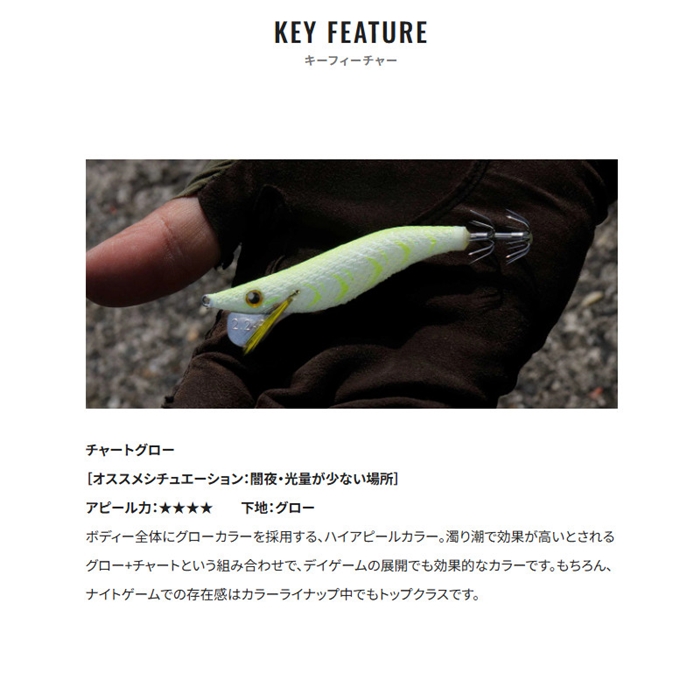 近年、注目されているライトエギング。ヒイカやツツイカなどを狙う、手軽だけどゲーム性が高いこの釣りに対して、専用エギとして開発されたセッピー。その最大の特徴は、しっかりと潮の流れを掴む潮受け感です。コンパクトなボディでありながら、潮の抵抗をしっかりと受けるフラットな面を背中に採用しています。そのため、ライトエギングでは特に有効なただ巻きでも潮流をキャッチし、ターゲットを誘います。また、2.2号は2.2秒/mという速めのフォールスピードに設定されているので、より確実に底取りができるのも特徴です。さらに、このコンパクトボディにフラッシュブーストを搭載したモデルまでラインナップ。バリエーションが増えたセッピーのローテーションで、さらに広がるライトエギングの世界を楽しんで下さい。