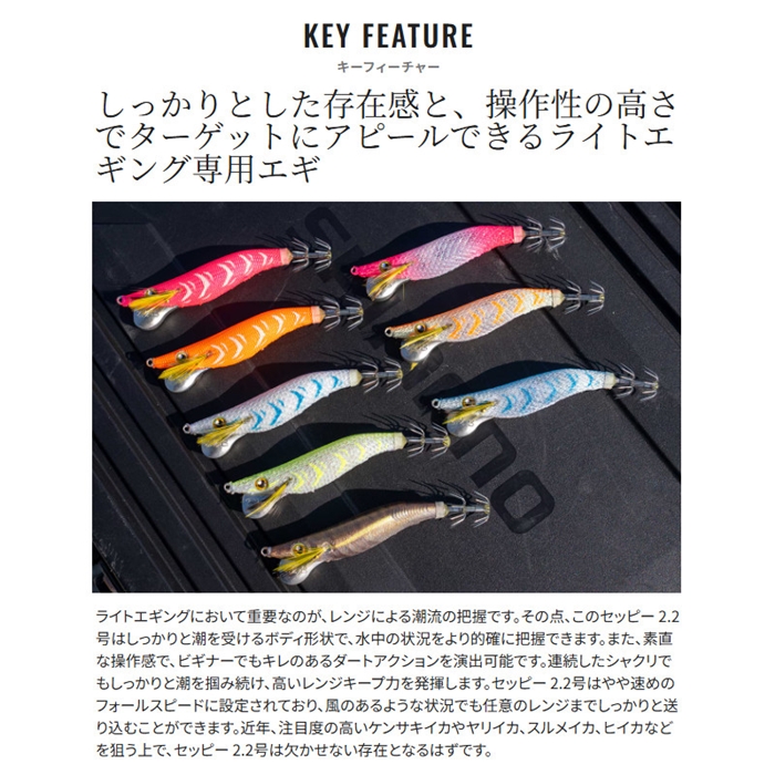 近年、注目されているライトエギング。ヒイカやツツイカなどを狙う、手軽だけどゲーム性が高いこの釣りに対して、専用エギとして開発されたセッピー。その最大の特徴は、しっかりと潮の流れを掴む潮受け感です。コンパクトなボディでありながら、潮の抵抗をしっかりと受けるフラットな面を背中に採用しています。そのため、ライトエギングでは特に有効なただ巻きでも潮流をキャッチし、ターゲットを誘います。また、2.2号は2.2秒/mという速めのフォールスピードに設定されているので、より確実に底取りができるのも特徴です。さらに、このコンパクトボディにフラッシュブーストを搭載したモデルまでラインナップ。バリエーションが増えたセッピーのローテーションで、さらに広がるライトエギングの世界を楽しんで下さい。